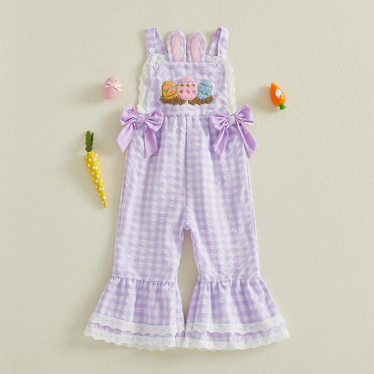 Toddler Baby Little Girls Plaid Jumpsuits Easter Egg Embroidery Sleeveless Bell-Bottom